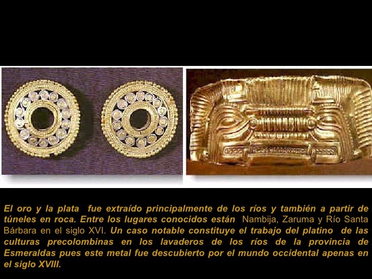 3. El oro y la plata fue extraído principalmente de los ríos y también a partir de túneles en roca. Entre los lugares conocidos están Nambija, Zaruma y Río Santa Bárbara en el siglo XVI. Un caso notable constituye el trabajo del platino de las culturas precolombinas en los lavaderos de los ríos de la provincia de Esmeraldas pues este metal fue descubierto por el mundo occidental apenas en el siglo XVIII.