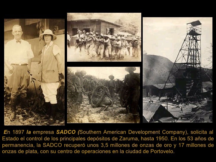 5. E n 1897 la empresa SADCO ( Southern American Development Company), solicita al Estado el control de los principales depósitos de Zaruma, hasta 1950. En los 53 años de permanencia, la SADCO recuperó unos 3,5 millones de onzas de oro y 17 millones de onzas de plata, con su centro de operaciones en la ciudad de Portovelo.
