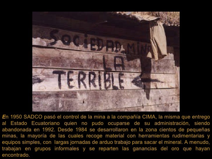 6. E n 1950 SADCO pasó el control de la mina a la compañía CIMA, la misma que entrego al Estado Ecuatoriano quien no pudo ocuparse de su administración, siendo abandonada en 1992. Desde 1984 se desarrollaron en la zona cientos de pequeñas minas, la mayoría de las cuales recoge material con herramientas rudimentarias y equipos simples, con largas jornadas de arduo trabajo para sacar el mineral. A menudo, trabajan en grupos informales y se reparten las ganancias del oro que hayan encontrado.