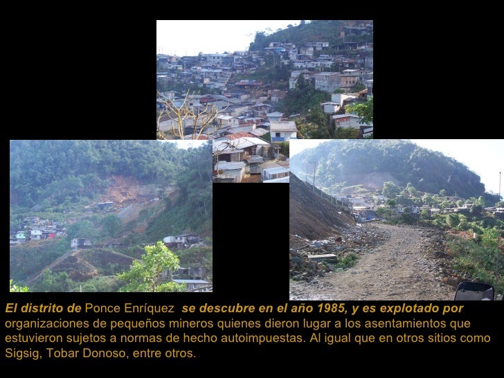 8. El distrito de Ponce Enríquez se descubre en el año 1985, y es explotado por organizaciones de pequeños mineros quienes dieron lugar a los asentamientos que estuvieron sujetos a normas de hecho autoimpuestas. Al igual que en otros sitios como Sigsig, Tobar Donoso, entre otros.